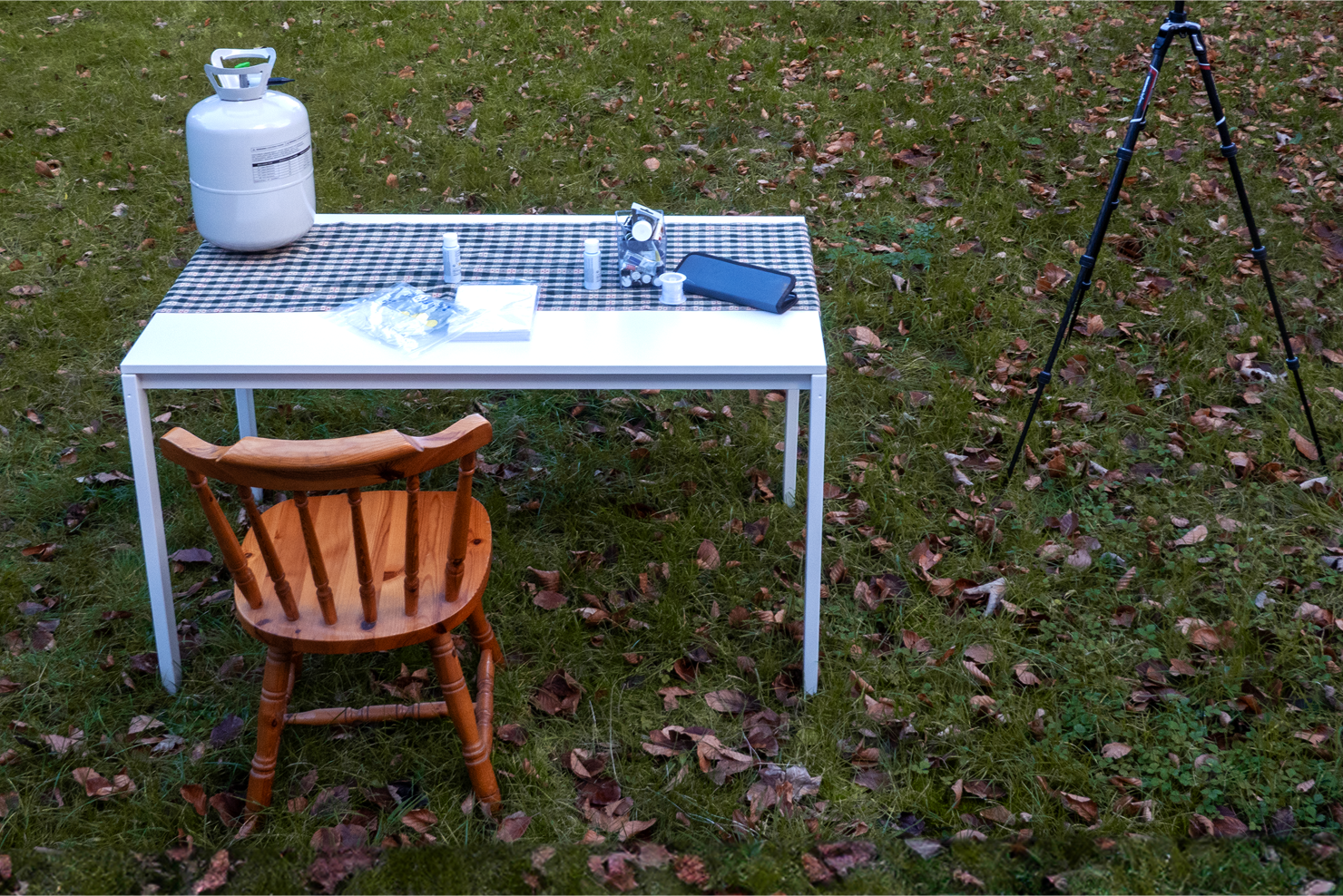 When the painting was finished, the balloon turned out to be too heavy to float above (3). Documentation was therefore continued. To conclude the documentation, a needle was brought and used to pop the balloon. As the balloon disappeared from sight, that pop (4) marked the conclusion of this performance.