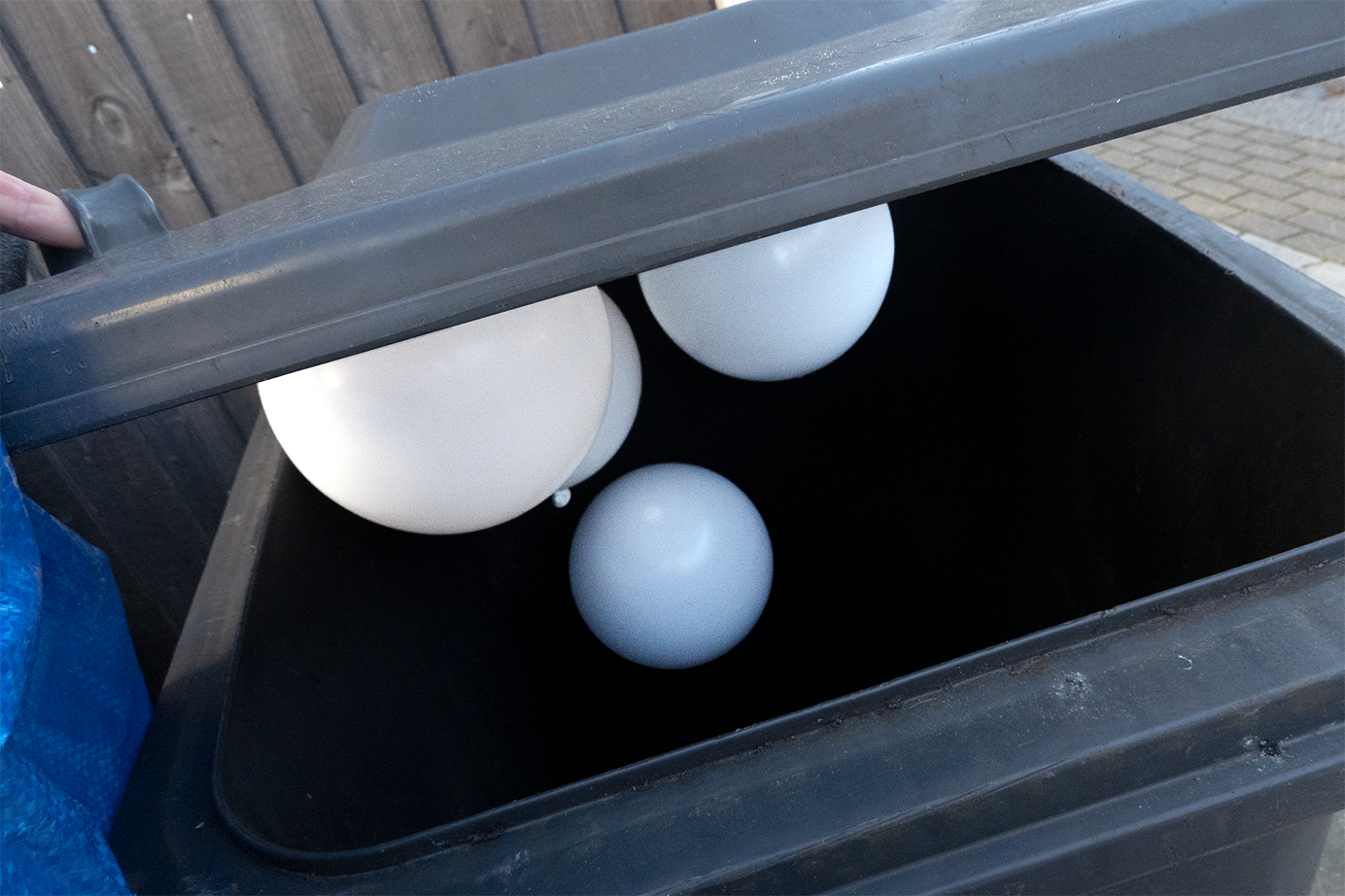 Additionally, five balloons—four filled with helium gas and one blown up using my mouth—were left in the bin. On the mouth-blown balloon, a short note that says ‘a good joke’ was written.