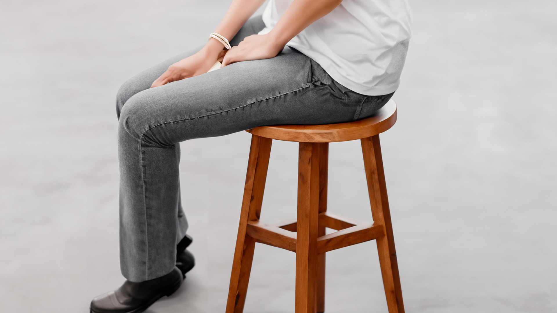 Phase 2: The performer picks up a rock and positions it beneath one of the stool's legs. This process is then repeated until rocks are placed under all four legs of the stool.